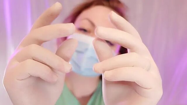 Sensual ASMR scene featuring nurse Arya Grander in surgical gloves. She teases with her PVC outfit and plays with the latex, creating a soothing and intimate atmosphere.